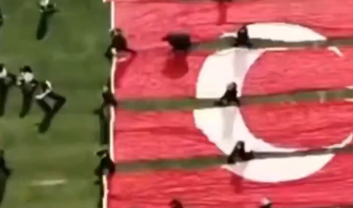 Tören sırasında çimlerin üzerine serilen ve 5 parçaya bölünmüş Türk bayrağının üzerinden yürünmesi, sosyal medyada da geniş yankı buldu. Stadyum görüntülerinde uzaktan bakılınca bayrağında üzerine basılıyormuş gibi görünen tören görüntülerinin aslı drone çekimleri ile ortaya çıktı.