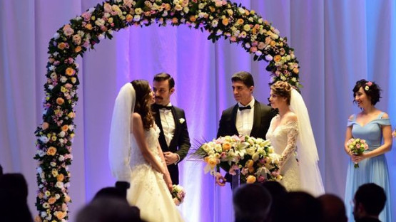 Özcan Deniz- Aslı Enver ile Salih Bademci-Dilara Aksüyek’in gelinlik ve damatlıkla kamera karşısına geçtiği çekimlerde erkekler şıklıkları gelinler ise güzellikleri ile dikkat çekti.