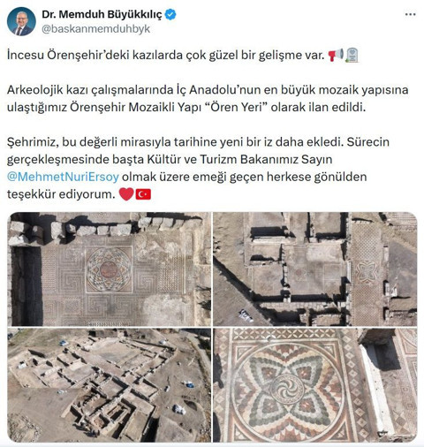 Yapılan açıklamada, “İncesu Örenşehir’deki kazılarda çok güzel bir gelişme var. Arkeolojik kazı çalışmalarında İç Anadolu’nun en büyük mozaik yapısına ulaştığımız Örenşehir Mozaikli Yapı 'Ören Yeri' olarak ilan edildi.